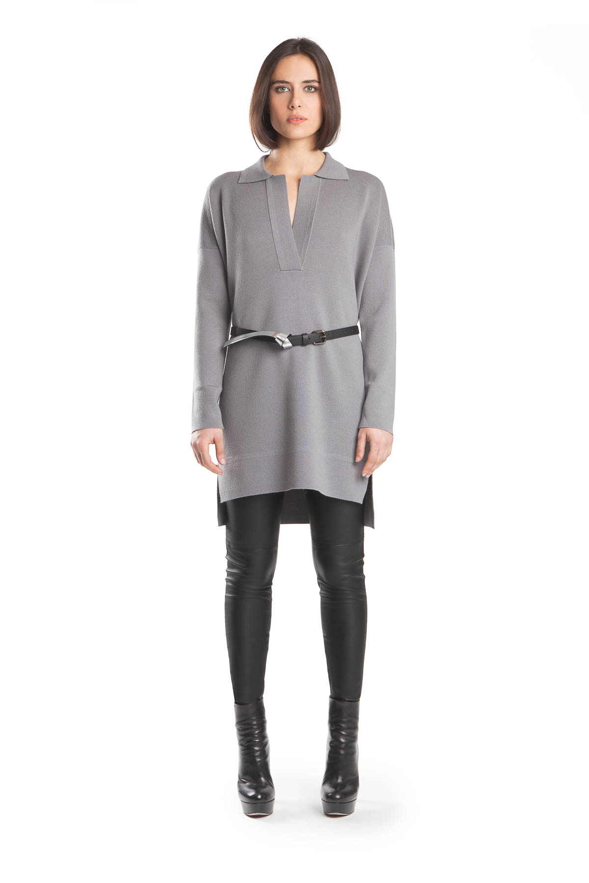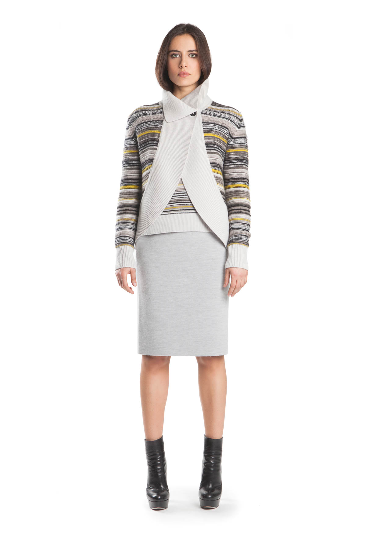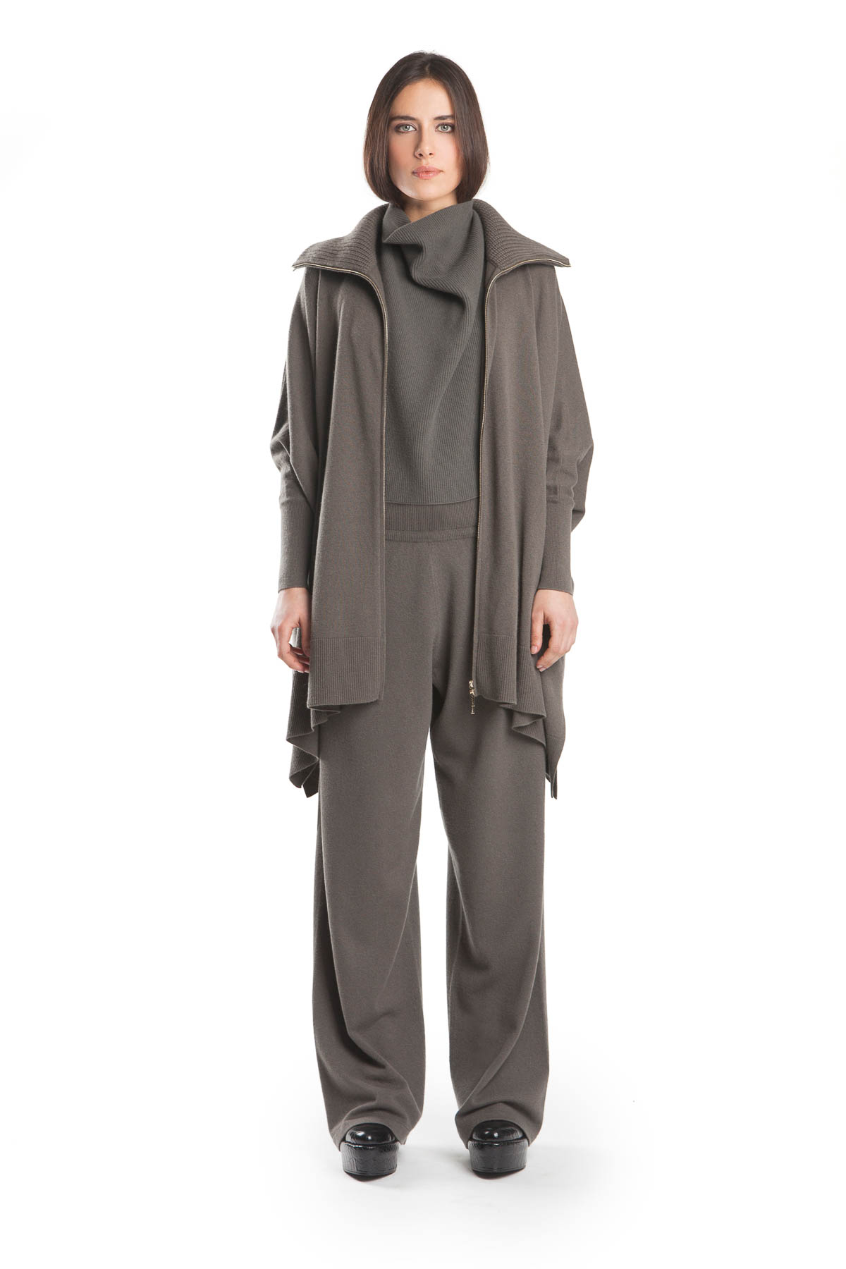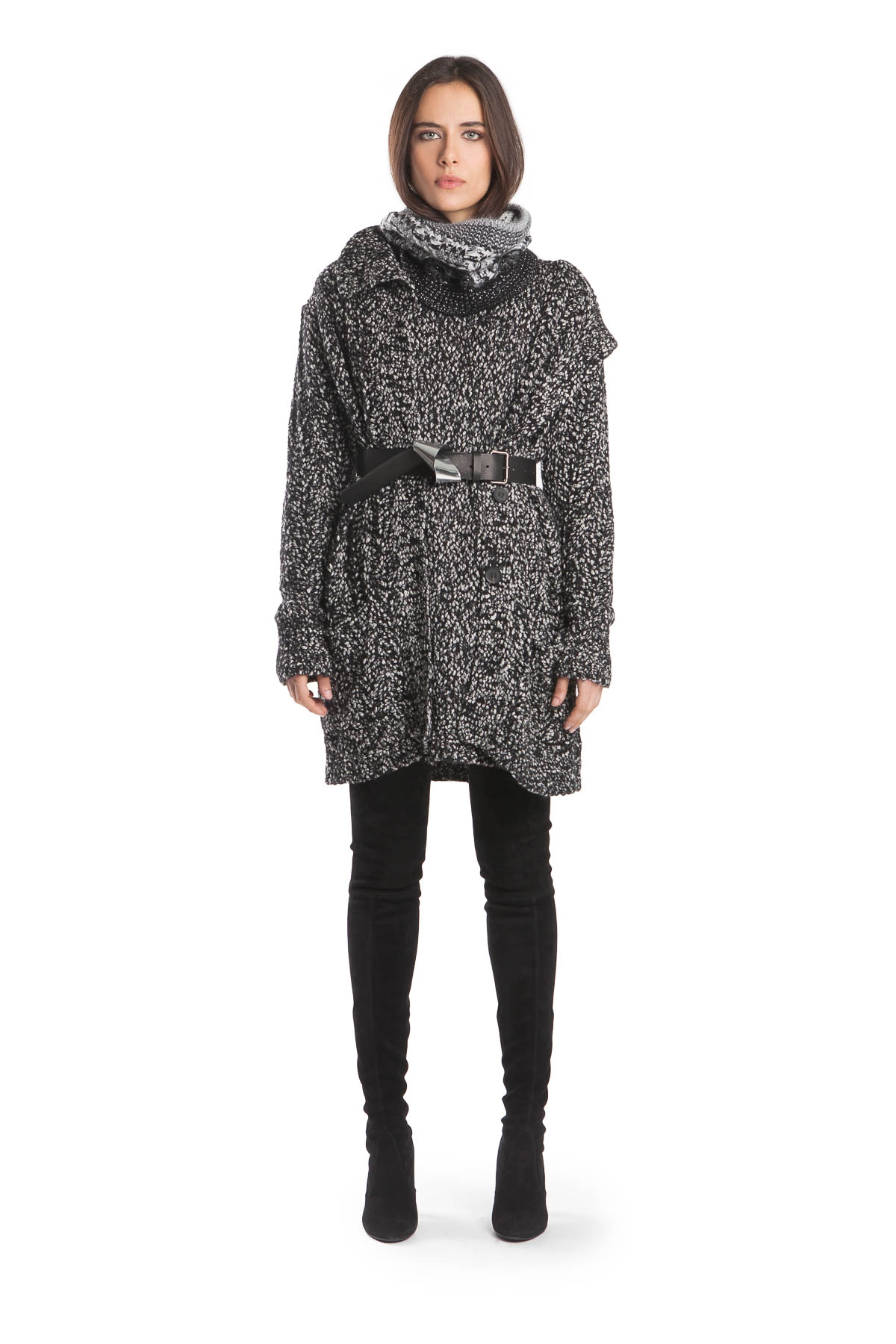 High neck cardigan 43% cotton + 31% polyamide + 26% wool merino extrafine CD18.453 col. 27580D Crewneck 43% cotton + 31% polyamide + 26% extrafine merino wool CD16.455 col. 27580D Neck warmer 70% cashmere + 20% mohair + 5% polyester +5% polyamide AD18.130 var. 2 Belt 100% leather AD18.951 var. 1