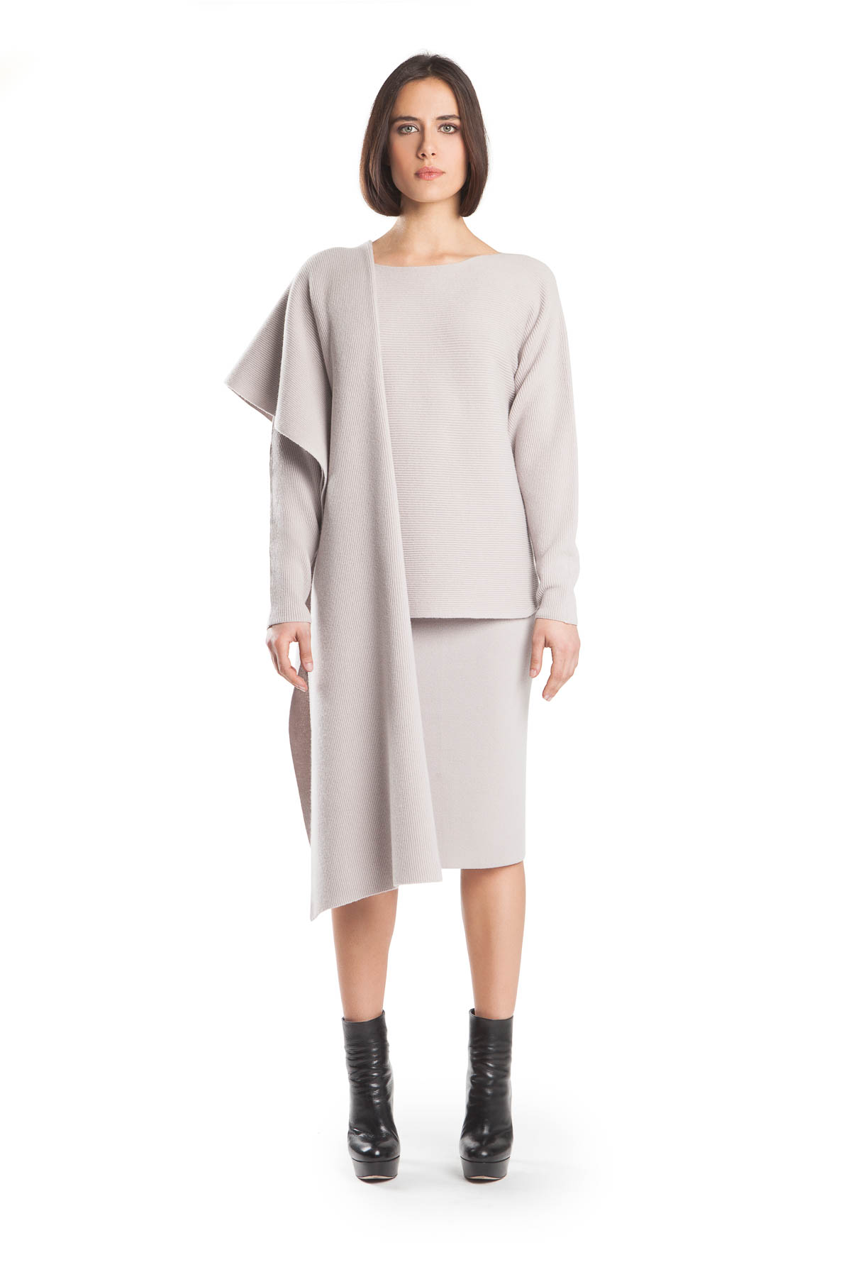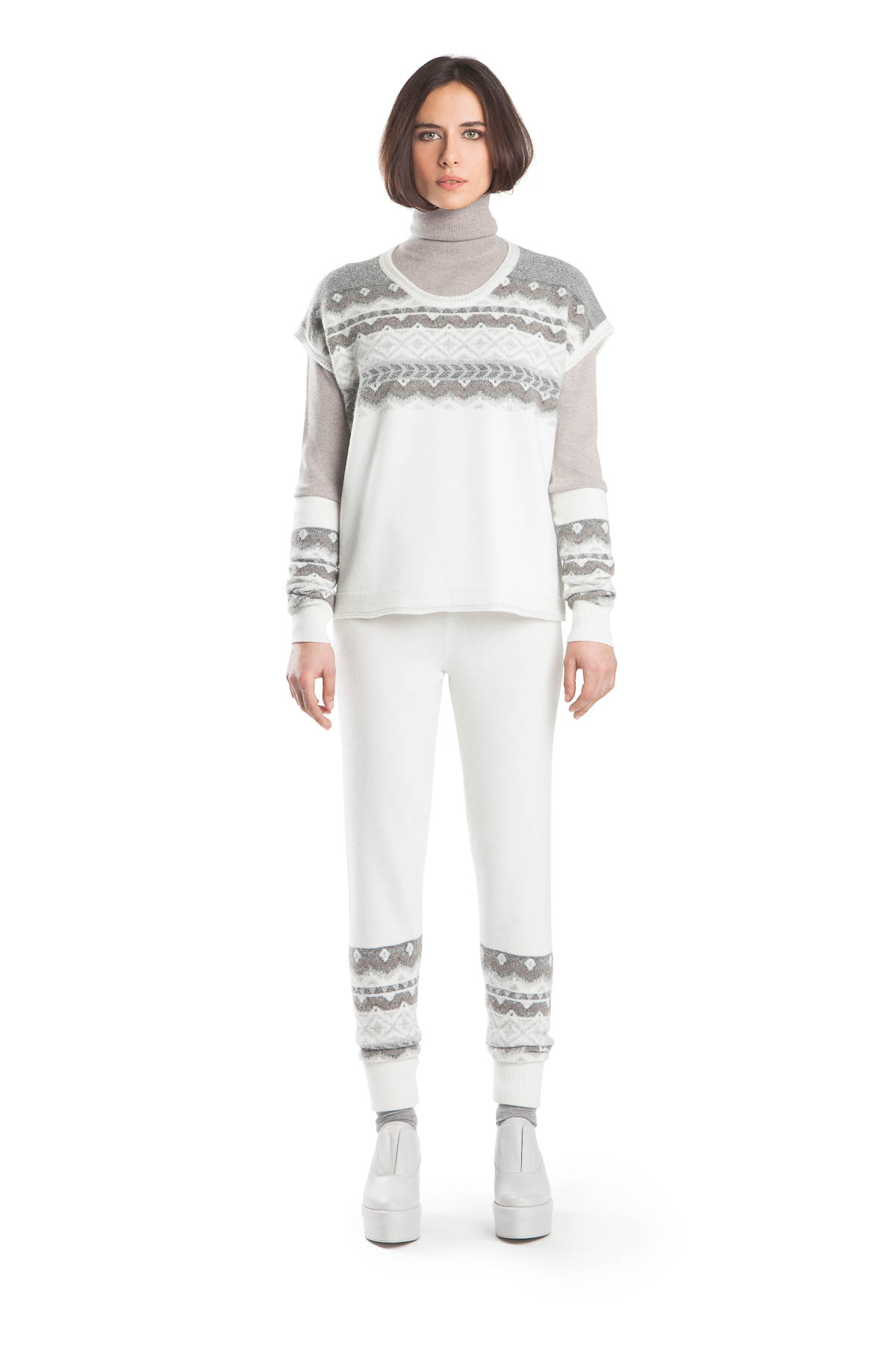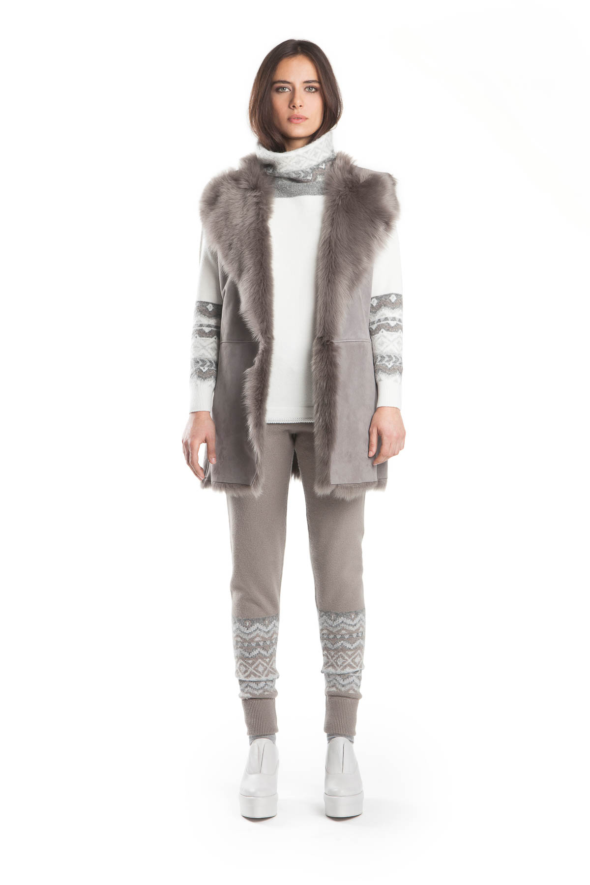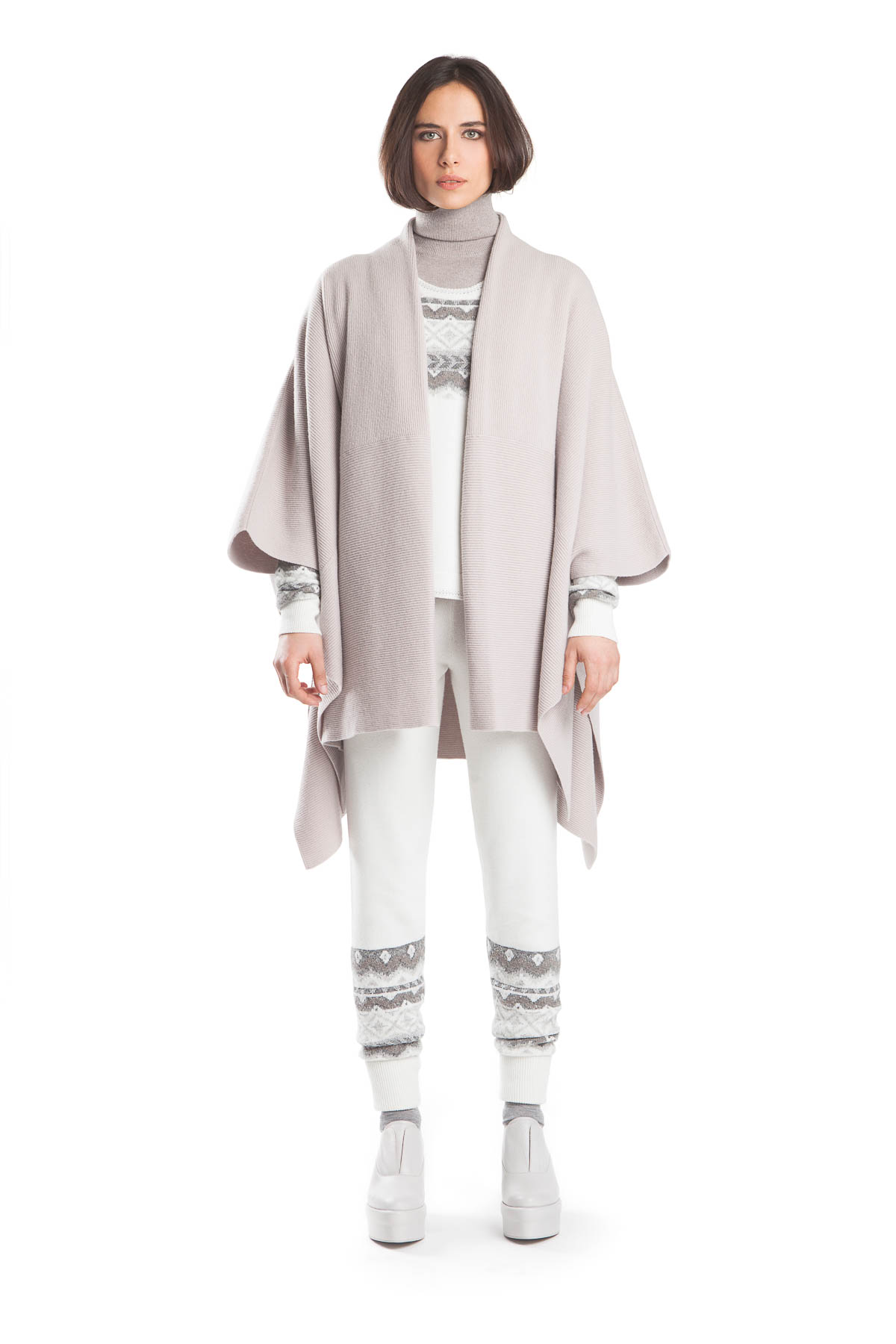 Gilet 85% cashmere + 15% other bres CD18.122 var. 1 Polo neck 100% cashmere CD17.202L col. 21866 – Trousers 85% cashmere + 15% other fibres CD18.124 var. 1 Muffs 85% cashmere + 15% other bres AD18.120 var. 1 Cape 70% lambswool + 30% cashmere CD18.372L col. 305950