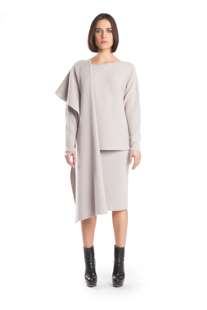 Look 5 Boat neck knit 70% lambswool + 30% cashmere CD18.373L col. 305950 Skirt 70% lambswool + 30% cashmere CD18.363L col. 305950 Scarf 70% lambswool + 30% cashmere AD18.370L col. 305950